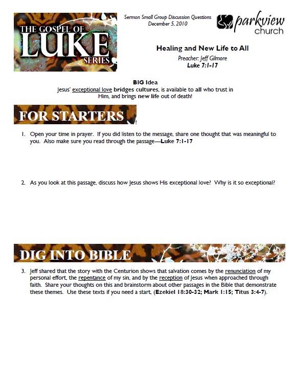 I write a Bible study for our church each week that is based on the sermon. Here is an example of one for this week’s sermon by Jeff Gilmore on Luke 7:1-17. You can use it if you are a Parkview Church small group leader to help you lead your discussion. You can also just use it for personal study and application after listening to the sermon this Sunday (Dec 5). Enjoy!