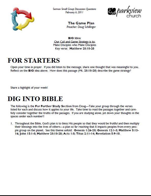 Friends, it is me again today!! We have finished a quick little series of sermons about our church, Parkview, and how it fits into God’s plan to bless all peoples on earth through Christ. This past Sunday’s sermon, by Doug Schillinger, talks about how Jesus made disciples. The study below goes through key passages on this theme and talks about how each of us can join in this great work. It is not necessary that you have heard the sermon, but I do recommend it (parkviewchurch.org). Use this for your personal study or print it out for your small group to seek to apply the truths of Scripture, no matter where you are at! God’s plan is awesome!! Click on the picture below to download the study: